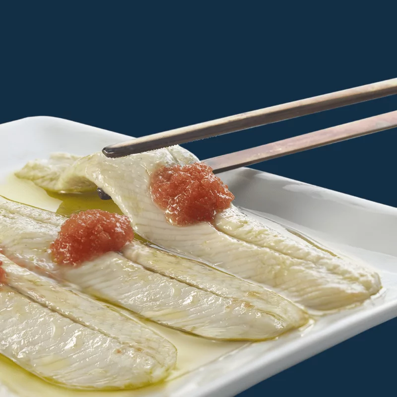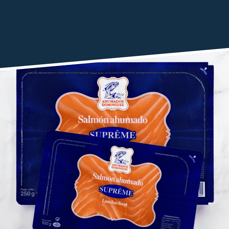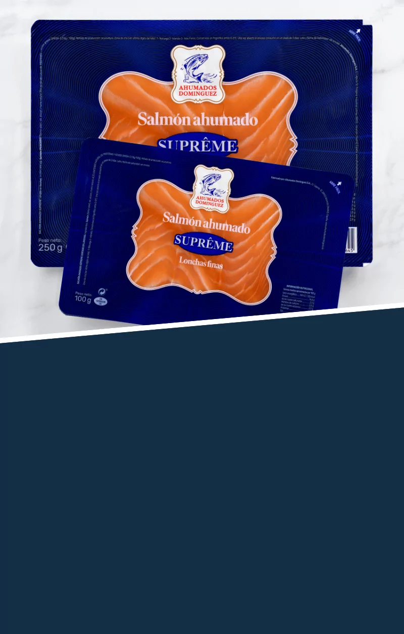 Por su gran delicadeza y por la ligereza de sus matices es por lo que el salmón ahumado de Domínguez se ha proclamado como el único salmón aromatizado del mundo. La fusión perfecta entre una materia prima excepcional, procedente de las aguas más puras del Atlántico Norte, y el humo natural que nace de una selección especial de maderas nobles, son la base de nuestro proceso de elaboración artesanal. Una receta secreta y única que se traduce en un aroma inconfundible y un sabor diferente.